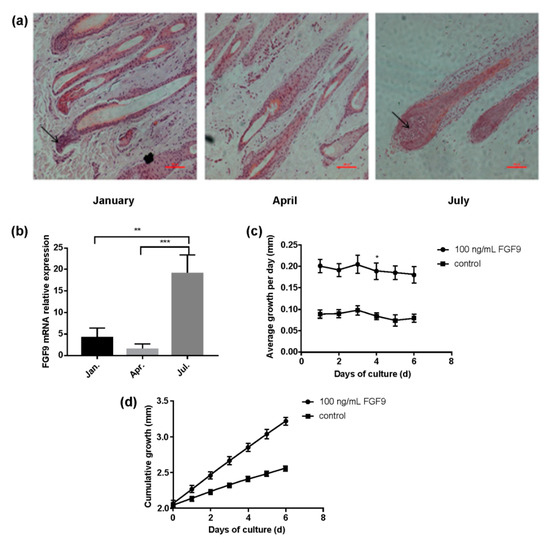 Involvement of FGF9 in wool growth of small-tailed Han sheep. (a) Skin tissue sections of small-tailed Han sheep were collected at different periods of the hair follicle (HF) cycle. The arrow points to DP, which is not obvious in the telogen phases. (January: catagen phase; April: telogen phase; July: anagen phase). (b) Relative mRNA expression of FGF9 in skin tissues at different periods (January (black): catagen phase; April (light grey): telogen phase; July (dark grey): anagen phase). (c) Comparison curves of the average daily growth of HFs cultured in a medium supplemented with 100 ng/mL FGF9 protein (solid line with circles) and the control group (solid line with squares). (d) Comparison curves of the cumulative growth of cultured HFs in a medium supplemented with 100 ng/mL FGF9 protein (solid line with circles) and the control group (solid line with squares). * p < 0.05; ** p < 0.01; *** p < 0.001.