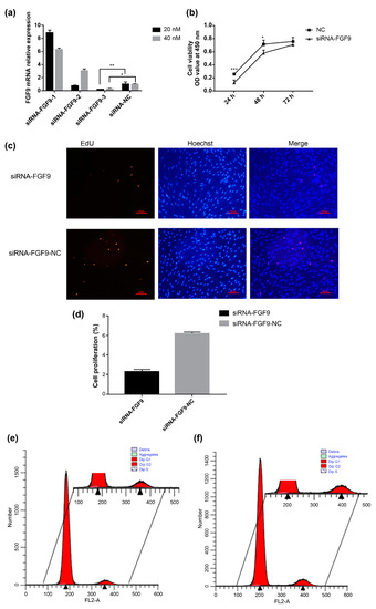 FGF9 knockdown inhibits DPC proliferation. (a) Changes in FGF9 expression levels after transfection with siRNA–FGF9-1, siRNA–FGF9-2, and siRNA–FGF9-3 for 48 h (black: 20 nM; grey: 10 nM). (b) Effects of different treatment durations on DPC proliferation after siRNA–FGF9-3 transfection; (negative control [NC]: solid line with squares; siRNA–FGF9: solid line with triangles). (c) Analysis of DPC proliferation using an EdU assay after 48 h of siRNA–FGF9 transfection (EdU-positive cells: red, Hoechst33342 [nuclei]: blue. (d) The rate of cell proliferation (EdU-positive cells as a percentage of the total number of cells). (e,f) DPC cycle analysis after 48 h of siRNA–FGF9 transfection (e: Cell transfection control [NC] group; f: siRNA–FGF9-transfected group). Red: Dip G1/2; white with blue lines: Dip S; light green: aggregates; blue: debris. * p < 0.05; ** p < 0.01; *** p < 0.001.
