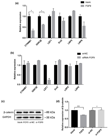 We examined the effects of FGF9 on the mRNA expression of key genes of the Wnt/β-catenin signaling pathway, including CTNNB1, GSK3β, LEF1, DVL2, LRP5, and LRP6, as well as that of β-catenin, a marker protein of the Wnt/β-catenin signaling pathway. After the exogenous addition of FGF9 protein to DPCs, the mRNA expression levels of CTNNB1, GSK3β, DVL2, and LRP6 decrease, with a significant decrease observed in that of CTNNB1 and GSK3β, whereas the expression levels of LEF1 and LRP5 increase (Figure 4a). Although there is no significant difference between them, compared with the control group, the mRNA expressions of CTNNB1, GSK3β, DVL2, and LRP6 in the FGF9 inhibited group show an upregulated trend, while the mRNA expressions of LEF1 and LRP5 show a downward trend (Figure 4b). Western blotting shows similar results; the protein expression levels of β-catenin decrease after the addition of FGF9 protein but increase after the inhibition of FGF9 expression (Figure 4c,d). Our findings show that the proliferation-promoting effects of FGF9 on DPCs may be regulated via the Wnt/β-catenin signaling pathway.