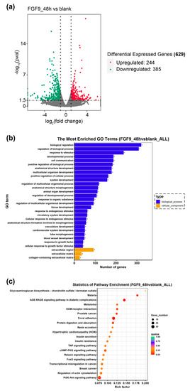 (a) Volcano plots of differential gene expression between DPCs treated with FGF9 for 48 h and the blank group (green: downregulated genes; red: upregulated genes). (b) Histogram of Gene Ontology (GO) enrichment in the biological processes (blue) and cellular composition (yellow) categories. The significance level of the enrichment is set to an adjusted p−value (padjust < 0.05). (c) Scatterplot for the Kyoto Encyclopedia of Genes and Genomes (KEGG) enrichment of differential genes. The bigger the circle, the more genes there are. The redder the colour, the smaller the Q−value, and the closer the Q−value number is to zero, the more it is significantly enriched.