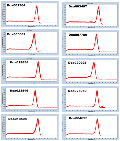 To uncover a suitable RG for normalizing the relative expression levels of leaf color-related genes in D. officinale via qRT-PCR, we selected ten candidate RGs (Table S1) from transcriptome data and subjected them to qRT-PCR analysis. The melting curves showed that the primers of each potential RG were highly specific (Figure 3). All ten genes exhibited a single peak with no primer dimer, and all amplicons showed good repeatability, confirming the accuracy, reliability, and specificity of primers.