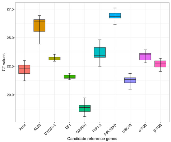 In order to assess the expression levels of each potential RGs, we automatically computed their respective Ct values. The results showed that the Ct values of the ten genes ranged from 18.858 (GAPDH) to 26.915 (RPL13AD) on average (Figure 4). The average Ct value of actin-7, UBQ10, EF1α, β-TUB, α-TUB, PIP1-2, ALB3, and CYCB1-2 was 22.241, 21.288, 21.493, 22.678, 23.386, 23.571, 26.069, and 23.230, respectively. CYCB1-2 exhibited the least expression variation from 22.94 to 23.93, followed by EF1α from 20.84 to 22.20 (Figure 4). The summary of the variation in expression levels (Ct values) of all candidate RGs is presented in Table S4. The coefficient of variation (CV) of Actin, UBQ10, GAPDH, EF1α, β-TUB, α-TUB, RPL13AD, PIP1-2, ALB3, CYCB1-2 was 2.33%, 2.13%, 2.18%, 1.57%, 1.54%, 1.45%, 1.30%, 2.82%, 3.11%, 1.14%, respectively (Table S4).