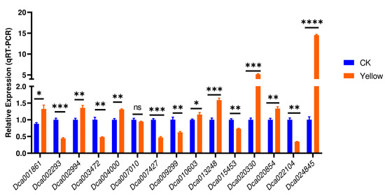 To confirm the reliability and stability of EF1α for accurate normalization of relative expression levels of leaf color-related genes, we investigated the expression of fifteen selected genes from the chlorophyll biosynthesis pathway (Figure 2B, Table S2) via qRT-PCR. As shown in Figure 6, the expression patterns of the targeted genes via qRT-PCR and RNA-Seq were consistent with identical regulation patterns. Dca001861, Dca002994, Dca004000, Dca010603, Dca013248, Dca020330, Dca020854, and Dca024845 were significantly up-regulated as per the results of transcriptomics analysis (Figure 6). Among them, Dca024845 and Dca020330 were the most significantly up-regulated, suggesting they might play crucial roles in yellow leaf development in D. officinale.