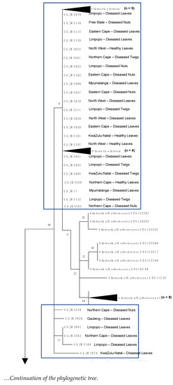 Symptomatic (diseased) and non-symptomatic (apparently healthy) pecan plant organs (leaves, shoots, and nuts-in-shuck) showed symptoms consistent with black spot disease, such as circular black spot lesions and slight-deep sunken lesions, and all the isolates were dark brown to black with a white margin pigmentation [18]. These pecan tissues were collected from different commercial pecan orchards from eight provinces in South Africa during the 2017-to-2019 seasons (Figure 1 and Supplementary Table S1). Samples of the leaves, nuts, and twigs were transported to the laboratory following a protocol [18]. Plant material was surface-sterilised by washing with tap water, disinfected in 2% sodium hypochlorite (NaOCl) for 3–5 min, rinsed with sterilised distilled water (dH2O) for 2 min and then dried using laboratory tissue paper. Pure Alternaria cultures were obtained as previously described by Achilonu et al. [18].