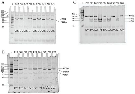 PAGE (12%) for detection of SP-D SNPs. L represents DNA ladder 50 bp, P represents patient number. (A) SP-D SNP rs721917, (B) SP-D SNP rs2243639, (C) SP-D SNP rs3088308.
