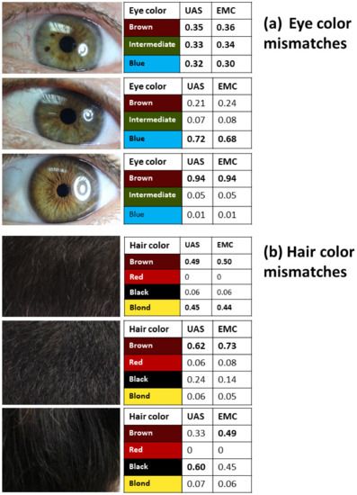 - Sharma, V.; Jani, K.; Khosla, P.; Butler, E.; Siegel, D.; Wurmbach, E. Evaluation of ForenSeq™ Signature Prep Kit B on predicting eye and hair coloration as well as biogeographical ancestry by using Universal Analysis Software (UAS) and available web-tools. Electrophoresis 2019, 40, 1353–1364. [Google Scholar] [CrossRef]