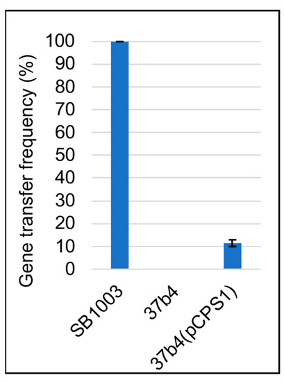 The recipient capability of the pCPS1 cosmid-complemented 37b4 strain relative to the WT strain SB1003 was quantitatively evaluated by mixing equal numbers of cells with equal numbers of RcGTAs and selecting for the transfer of a kanamycin-resistance marker. As shown in Figure 4, it was found that the relative recipient capability (expressed as relative numbers of kanamycin-resistant colonies resulting from gene transfer) of strain 37b4 was zero, whereas that of 37b4(pCPS1) was 11.5%, relative to strain SB1003. Therefore, although the cosmid pCPS1 provided strain 37b4 with genes essential for recipient capability, the frequency of gene transfer was less than that of the WT strain SB1003.