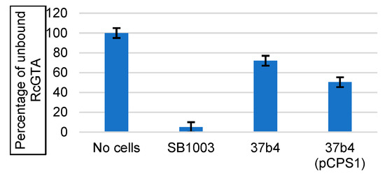 Figure 5. Binding of RcGTA to cells. RcGTA was incubated with SB1003, 37b4, or 37b4(pCPS1) cells to allow binding, cell-bound RcGTA was removed by centrifugation of cells, and residual RcGTA recovered from the supernatant. The relative amount of unbound RcGTA is indicated by the number of kanamycin-resistant SB1003 colonies due to the RcGTA-mediated transfer of locus rcc02539 disrupted by a kanamycin resistance cassette. Blue bars represent the average of three biological replicates, and error bars show the standard deviation.