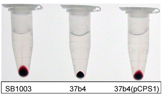 To directly demonstrate whether a capsule is present in strains SB1003, 37b4, and 37b4(pCPS1), we first used a cell centrifugation assay that had been previously employed [14,15]. In this assay, equal numbers of cells are centrifuged, and the absence of a capsule is indicated by a relatively small and tight cell pellet compared to an encapsulated strain such as SB1003. It was found that strain 37b4(pCPS1) exhibited a relatively large, diffuse, and mucoid cell pellet compared to the parental strain 37b4 and similar to that of SB1003 (Figure 6).