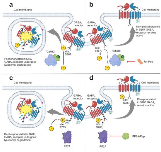 Effect of synthetic inhibitors on GABAB receptor recirculation. (a) Phosphorylation of GABAB in the S867 site mediated by Ca2+/calmodulin-dependent protein kinase II (CaMKII) leads to lysosomal degradation in the receptor. (b) The R1-Pep peptide inhibits the GABAB receptors’ interactions with CaMKII, preventing phosphorylation. Non-phosphorylated S867 receptors tend to return to the cell surface instead of being degraded. (c) Dephosphorylation of GABAB receptors in the S783 site mediated by protein phosphatase 2A (PP2A) leads to lysosomal degradation in the receptor. (d) PP2A-Pep inhibits the GABAB receptor’s interaction with PP2A, preventing its phosphorylation. Receptors with phosphate in the S783 site tend to return to the cell surface instead of being degraded. The illustration was made using BioRender.