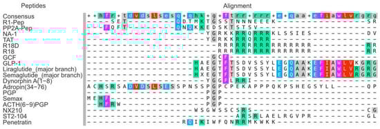Figure 2 shows multiple sequence alignments for IPs, CARPs, CPPs, and mimics of natural regulatory peptides described in this review. The results were obtained using the MAFFT v7 tool. The similarity between the structures of the GLP-1-related peptides (GLP-1, major branches of liraglutide and semaglutide) is visible. In addition, arginine-containing peptides (TAT, R18, R18D) clustered. Moreover, the NA-1 peptide, which is related to the IP group, belonged to this cluster too. Subsequently, PGP-containing peptides (PGP, Semax, ACTH(6–9)PGP, and adropin(34–76)) clustered independently. Concomitantly, the IPs did not cluster. Thus, R1-Pep, PP2A-Pep, and NA-1 did not have similar domains based on the results obtained from the MAFFT v7 tool. Interestingly, the dynorphin A(1–8), NX210, ST2-104, and GCF peptides did not belong to any cluster. Perhaps peptides have more complex and nonlinear correlations between their structures and neuroprotective properties.