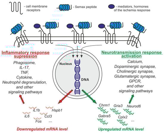 Recently, using RNA-Seq, we studied the protective properties of the Semax peptide at the transcriptome level under transient MCAO conditions. Previously, we studied the gene expression in rat brain under conditions of incomplete global ischemia of the rat brain and permanent MCAO using real-time reverse transcription polymerase chain reaction (RT-PCR). Thereby, we showed that the peptide affects the expression of a limited number of genes encoding neurotrophic factors and their receptors [,]. Using RatRef-12 BeadChips, it was shown that Semax affects the expression of genes associated with the immune and vascular systems in the brain of rats after permanent MCAO [,]. Using RNA-Seq analysis, we identified several hundred differentially expressed genes (DEGs) (>1.5-fold change) in the brains of rats 24 h after transient MCAO treated with Semax compared with control animals treated with saline [,]. We found that Semax suppressed the expression of genes associated with inflammatory processes (e.g., Hspb1, Fos, iL1b, iL6, Ccl3, Socs3) and activated the expression of genes associated with neurotransmission (e.g., Cplx2, Chrm1, Gabra5, Gria3, Neurod6, Ptk2b), while IR, on the contrary, activated the expression of genes involved in inflammation, immune response, apoptosis, and stress response and suppressed the expression of genes associated with neurotransmission. Analysis of signaling pathways associated with Semax-induced DEGs in the transient MCAO rat model using a web server for functional enrichment analysis (g:ProfileR) and Gene Set Enrichment Analysis (GSEA) data showed that DEG activation in Semax-treated rats 24 h after MCAO was associated with calcium signaling, dopaminergic, cholinergic, the glutamatergic synapse, and G-protein coupled receptor (GPCR) signaling through chemical synapses, whereas DEG suppression was associated with the phagosome, interleukin 17 (IL-17), tumor necrosis factor (TNF), p53 signaling pathways, innate immune system, neutrophil degranulation, and cytokine signaling in the immune system []. Thus, according to RNA-Seq data, 24 h after transient MCAO, Semax initiated a neurotransmitter and anti-inflammatory response that compensated for mRNA expression patterns that were disturbed under IR conditions. Perhaps, Semax can mediate its influence on gene expression indirectly through interaction with receptors on the cell membrane. Moreover, the action of Semax, which is able to reduce the disturbances caused by ischemia, can be explained by joint action of peptide on receptors in an allosteric manner, together with hormones and mediators of the ischemic response. The model of the influence of Semax on the transcriptome of brain cells and the spectrum of Semax effects identified at the gene expression level at 24 h after transient MCAO in rats is shown in Figure 3.