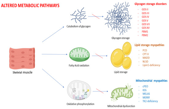 Metabolic pathways and corresponding metabolic myopahties. Created with BioRender.com (https://www.biorender.com/ accessed on 4 April 2023).