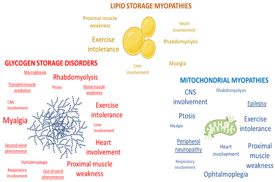 Figure 2 depicts clinical symptoms and/or signs highly suggestive of metabolic myopathies, such as bouts of rhabdomyolysis, myalgia, cramping, exercise intolerance, and myoglobinuria/pigmenturia. Some patients present fewer specific symptoms and/or signs, such as fixed or progressive weakness affecting pelvic, scapular, axial, and/or limb musculature [19]. When present, muscle weakness may vary from mild to generalized, resulting in life-threatening hypotonia and respiratory insufficiency.