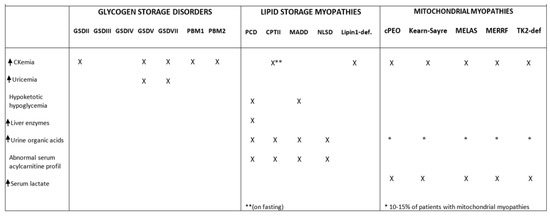 Biomarkers in metabolic myopathies. “ ** ” in patients with CPT II, hyperCKemia is frequent during fasting. “ * ” 10–15% of patient with mitochondrial myopathies can present abnormalities in urine organic acids level.