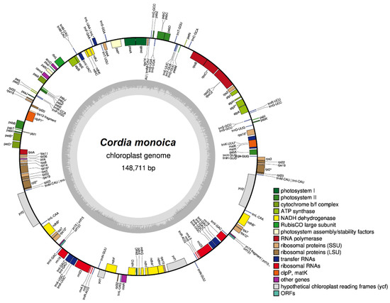 Cordias are deciduous shrubs or trees belonging to the subfamily Cordioideae of the Boraginaceae family, which was previously distinguished as a separate family known as Cordiacea (Tropicos.org). Approximately 300 species are known to exist in both hemispheres, including Mexico, Central America, South America, the Arabian Peninsula, Pakistan, Sri Lanka, India, East and West Africa, Nigeria, and Ghana [18]. The tree grows up to 6 m tall and it bears white flowers and yellow fruit, with ovate leaves that can reach up to four inches long. Typically, the fruit measures between 0.5 and 1 inch long, and the flowering and fruiting process occur between October and December [19]. It has been reported that many species of Cordia have been used in traditional medicine for centuries to treat a range of ailments, including C. monoica, which showed significant anti-ulcer activity. Additionally, C. monoica leaves are used as a vapor bath for leprosy, its roots for vomiting, and its stem bark for chest pains [18,20,21,22,23]. Currently, there are only a few species of Boraginaceae chloroplast genome in GenBank, while C. monoica has never been sequenced. It remains important to further research on this family of chloroplast genomes, since significant variations are observed in the length of chloroplast genomes sequences. For example, Pholisma arenarium (GenBank accession: NC_039719) and Lennoa madreporoides (GenBank accessions: NC_039720) show 81,198 and 83,675 bp of length, respectively.
