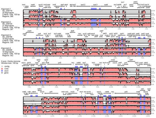 The chloroplast alignment indicates numerous changes between C. monoica and related species (P. arenarium, L. madreporoides, B. officinalis, and O. fuyunensis). The main variations found in the cp genomes length are, therefore, differences in the length of each region and the positioning of its boundaries (Table 3). The size cp genome ranges from 81,198 bp (P. arenarium) to 150,612 bp (O. fuyunensis). A significant difference is observed among the studied species of the family Boraginaceae. In two of the five species (P. arenarium and L. madreporoides), a severe reduction in the cp length is detected, 60% less in length compared C. monoica, yet the four cp regions are possibly annotated. The reduction is asymmetric among all regions; the LSC and SSC sever the major parts in contrast to the IR regions, that show high level of conservation and only 17.3% less than the IR region length in C. monoica. Based on the mVista, the missing regions contain coding genes, including ATP subunits, RNA polymerase genes, photosystem I, II, assembly and stability factors, and NADH dehydrogenase subunits (Figure 3).