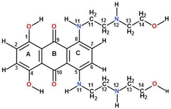 We selected mitoxantrone (MTX) as a ligand for the present study on Mtb gene sequences. Mitoxantrone, 1,4-dihydroxy-5,8-bis[[2-[(2-hydroxyethyl) amino]ethyl] amino] anthracene-9,10-dione (Figure 1), known as a clinically approved anticancer drug, was found to target the human telomeric G4 DNA sequence leading to the inhibition of the telomerase enzyme []. MTX is a frequently used anthraquinone derivative in view of its non-cardiotoxicity because it lacks the amino sugar fragment and has a hydroxyquinone functional group with a polyamide side chain.