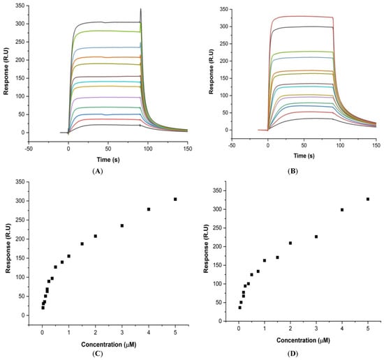 Results of the SPR for the interaction of MTX with G4 DNA using a HEPES buffer (pH 7.4) with 100 mM KCl at 25 °C. Sensograms obtained for the increasing concentration of MTX from 0.03 μM (bottom) to 3.0 μM (top): (A) mosR and (B) ndhA. Plot of steady-state binding showing the Response Unit (R.U.) as a function of the concentration of MTX: (C) mosR and (D) ndhA.