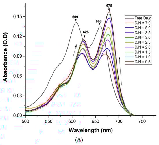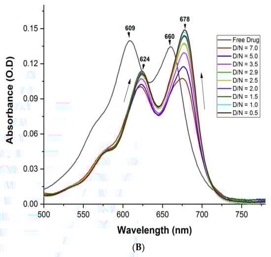 The assessment of the binding of a variable ratio of ligand (D) and target G4 DNA (N) sequence was indicated by the absorption spectra. MTX shows four distinct wavelength maxima, λmax = 242, 276, 609 and 660 nm []. A change in absorbance in the visible region was used for the analysis, as DNA does not contribute to the absorbance in this region. Upon the stepwise addition of varying concentrations of mosR G4 DNA to a fixed concentration of MTX (7 μM), the intensity of both absorption bands of MTX showed hypochromism of ~35% at D/N = 5.0 accompanied by a red shift, Δλmax = 16 and 18 nm at 609 and 660 nm, respectively. Further addition of mosR resulted in hyperchromism with no further change in the wavelength maxima, the increase in absorbance being significant, up to ~75% at D/N = 0.5 at 678 nm (Figure 3A). In the case of the ndhA G4 DNA, similar hypochromism of ~29% at D/N = 5.0, accompanied by a red shift of 15 and 18 nm at 609 and 660 nm, respectively, followed by hyperchromism at D/N = 0.5, was observed (Figure 3B). This demonstrates the presence of two binding modes, one at D/N > 5.0 while the other exists at lower D/N ratios, in which most of the MTX is expected to be bound at preferential sites on the G4 DNA. The absence of an isobestic point indicates the existence of more than one stoichiometric complex. The binding characteristics are found to be similar to that observed with tetramolecular parallel stranded G4 DNA []. In the absence of a large red shift of ~45 nm, which is characteristic of classical intercalation [], the predominant mode of binding to mosR and ndhA G4 DNA sequences is expected to be partial stacking via the insertion of chromophore of MTX in the vicinity of base quartets or end stacking with G-quartets in addition to external groove binding of the side chains []. A detailed analysis of the absorbance data (Figures S3A–C and S4A–C) is indicative of the stoichiometry of the MTX–G4 DNA complex as 1, 2, 4 and 1, 2 in the MTX–mosR and MTX–ndhA complexes, respectively, which may arise from simultaneous stacking at the ends and groove binding near loops. An estimate of the intrinsic binding constant is Kb = 1.6 × 104 M−1 and 1.6 × 106 M−1 at D/N = 0.36–2.00 and 2.00–3.80, respectively, for the mosR complexes, while the corresponding value for the ndhA complexes is Kb = 1.0 × 106 M−1 and 8.7 × 104 M−1 at D/N = 0.36–3.80 and 3.80–8.75, respectively (Figures S3A–C and S4A–C). The Scatchard plots were found to be nonlinear and could not be used to determine the binding affinity as they did not fit into a combination of 2–3 straight lines. The intrinsic binding constants may be considered as a rough estimate due to the existence of multiple binding sites, neighbor exclusion effects, and ligand–ligand interactions []. The existence of multiple binding sites resulting in the absence of a clear isobestic point has previously been reported in the literature [].