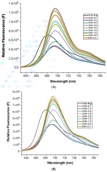 Fluorescence spectra of 7 μM MTX with increasing concentration of G4 DNA at D/N = 0.3–8.7 in 10 mM of KBPES buffer (pH 7.0) containing 100 mM KCl at 25 °C, λex = 610 nm: (A) mosR and (B) ndhA.