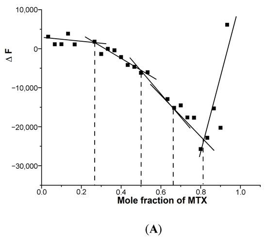 Since the binding of MTX to G4 DNA showed the formation of more than one bound complex, we established the stoichiometry independently with the continuous variation method (Job plot) using fluorescence. An analysis of the Job plot (Figure 5A,B) indicates several inflection points between approximately linear regions [,].