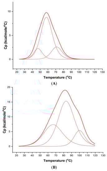 The thermal denaturation profiles of ordered to disordered 100 μM mosR/ndhA G4 DNA sequences were monitored using Differential Scanning Calorimetry (DSC), which yields the melting temperatures (Tm) by measuring the changes in heat capacity as a function of temperature. The DSC data was deconvoluted and found to fit into three “two state” transition models, yielding three melting temperatures (Tm), indicating the existence of two intermediate species in the melting pathway. The three melting temperatures Tm1, Tm2, and Tm3 are centered at 47.3, 58.3, 71.4 °C and 46.8, 64.0, 84.4 °C for the mosR and ndhA G4 DNA sequences, respectively (Figure 7A,C). Upon the binding of MTX to mosR G4 DNA at D/N = 5.0, it is observed that Tm increases, yielding thermal stabilization at ∆Tm1 = 19.9 °C, ∆Tm2 = 25.3 °C and ∆Tm3 = 28.8 °C, while the corresponding stabilization in ndhA G4 DNA is ∆Tm2 = 17.9 °C and ∆Tm3 = 10.1 °C (Figure 7B,D). These values of ∆Tm (Table 1) are comparable to that obtained for other ligands to mosR/ndhA and other G4 DNA [,].