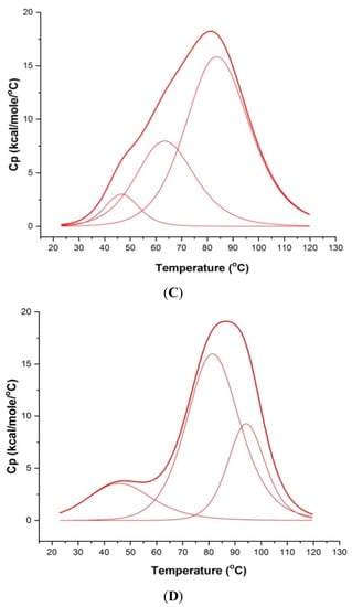 Melting profiles showing excess heat capacity as a function of temperature: (A) 100 μM free mosR; (B) MTX–mosR complex at D/N = 5.0; (C) 100 μM free ndhA; and (D) MTX–ndhA complex at D/N = 5.0 in 10 mM of KBPES buffer (pH 7.0) containing 100 mM KCl. The observed raw data (thick red lines) in each Figure have been deconvoluted into three “two-state” processes (thin red lines), respectively, using Origin 7.0.