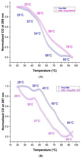 Thermal melting profiles were performed [] with a temperature range from 25–95 °C at the rate of 1 °C/min using a Jasco J-1500 CD Spectrometer (Jasco, Tokyo, Japan) equipped with a MCB-100 Mini circulation Bath, Peltier unit-controlled cell holder, and a xenon lamp.