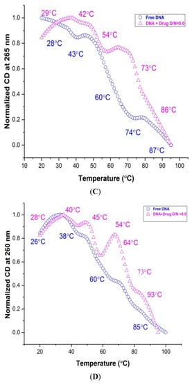 Structure-dependent melting profiles from the folded to unfolded conformation of mosR/ndhA G4 DNA in the native and complexed state at D/N = 5.0 were obtained from CD measurements at 265/260 and 287/288 nm with respect to the temperature at 2 °C intervals. The melting transitions of free mosR G4 DNA, yielded Tm values at 25, 32, 54, 68, 85 °C and 28, 43, 60, 74, 87 °C at 288 and 265 nm (Figure 8A,C), respectively, which correspond well to the Tm value 47.3, 58.3, 71.4 °C observed in the DSC thermograms as well as that reported in the literature []. Similarly, the Tm values 28, 39, 45, 60, 84 °C and 26, 38, 60, 85 °C observed at 287 and 260 nm, respectively, for ndhA G4 DNA (Figure 8B,D), correspond to the 46.8, 64.0, 84.4 °C obtained from the DSC thermograms. Upon complex formation at D/N = 5.0, Tm is found to increase in both complexes, yielding a thermal stabilization of ∆Tm up to ~26 and 20 °C in mosR and ndhA complexes, respectively (Figure 8A–D; Table S8A,B). We observed that the melting pathways observed at two wavelengths, 265/260 and 288/287 nm, were different, giving rise to different ∆Tm values. This is expected as melting transitions involve the reordering of a mixture of parallel/antiparallel hybrid conformations, which contributes differently to CD at 265/260 and 288/287 nm. The same has also been reported in the literature on the binding of ligands, BRACO-19 and c-exNDI 2 to mosR/ndhA G4 DNA [] as well as 2,6 disubstituted anthraquinones to human telomeric G4 DNA []. It has been shown that the groove binding of mitoxantrone in monomeric/dimeric form to parallel d-[TTGGGG]4 [] and d-[TTAGGG]4 [] G4 DNA increases thermal stability by ~25 °C and, consequently, inhibits telomerase enzyme activity. The observed ∆Tm obtained on the external groove/end stacking of mitoxantrone to mosR/ndhA G4 DNA are comparable to these results.