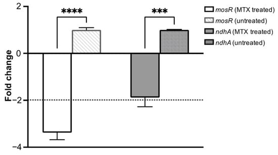Mtb H37Rv was treated with 5XMIC of MTX; RNA was isolated and subjected to qRT-PCR for mosR and ndhA. qRT-PCR data showing the expression of the genes were normalized with 16S rRNA and compared with the untreated control. The data shown are the result of three independent experiments. Results are expressed as mean ± SD. *** p < 0.001 **** p < 0.0001.