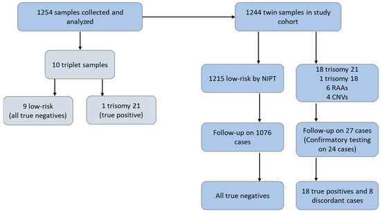 All patients had to have a maternal age of at least 18 years, with a minimum gestational age (GA) of 10 weeks for inclusion in the study. The cohort included monochorionic and dichorionic twin pregnancies and triplet pregnancies both naturally conceived or conceived with assisted reproductive techniques (ART). Chorionicity was assessed by ultrasound and different sexes. All patients received pre-test counselling, and written informed consent was obtained before blood collection. Patients were offered the choice of screening for common trisomies only or to undergo genome-wide NIPT, which included screening for common trisomies, RAAs, and CNVs; presence or absence of chromosome Y was also reported for all patients. In the case of an abnormal test result, additional counselling was provided by a clinical geneticist or obstetrician [17], and confirmatory testing in material obtained via amniocentesis or chorionic villus sampling was offered.
