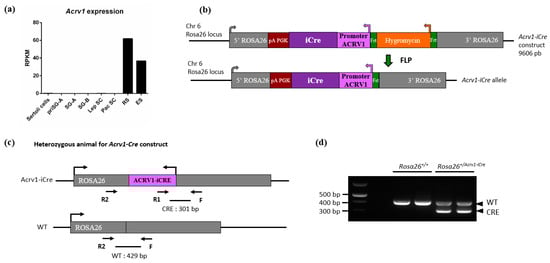To establish the Rosa26Acrv1-iCre/+ line (called hereafter Acrv1-iCre), the cDNA of iCre recombinase gene was inserted under the control of the Acrv1 promoter sequence described in [,]. An hygromycin-resistant cassette, flanked by flippase recognition target sites, was introduced as a selection marker downstream of Acrv1-iCre. Two homology arms for the Rosa26 locus were used to insert the construct at this precise locus. The targeting construct was introduced by electroporation into embryonic stem cells from the C57BL/6J mouse strain and selected on plates containing hygromycin. Positive ESCs clones were identified by polymerase chain reaction (PCR) and confirmed by Southern blot analysis with 5′–3′ probes and an internal probe. Homologous recombinant clones were also sequenced and karyotyped. Stem cells carrying the construct were injected into blastocysts from C57BL/6J mice to obtain chimeric mice. After germline transmission, the generated Knock-In Acrv1-iCre mice were crossed with the Flp-deleter line to eliminate the hygromycin cassette []. No deleterious phenotype or health defects were observed in the transgenic males and females that were produced during the approximately 2 years of the project.