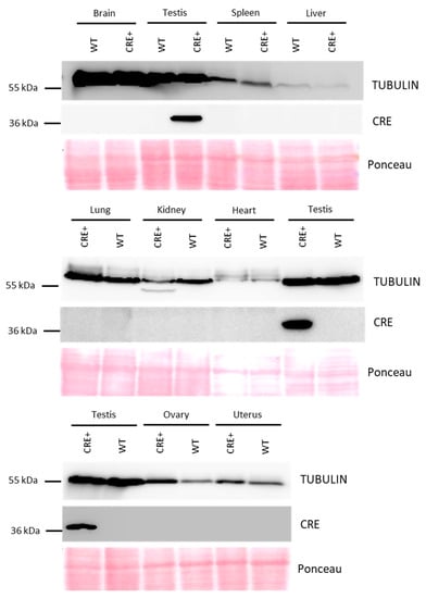 To control that the Cre expression is not leaky, we analyzed by western blot transgenic male and female organs important for survival and/or metabolism, such as the brain, liver, lung, kidney, spleen, and heart, and organs from the male and female reproductive tract, i.e., testes, ovaries, and uterus. As shown in Figure 2, Cre protein is only detected in the testis.