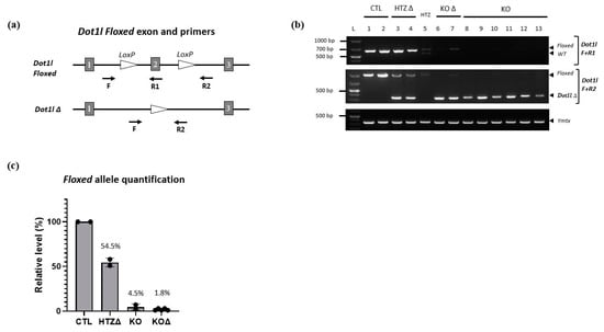 Despite the fact that Cre expression is specific, this does not ensure its efficiency. We therefore assessed Acrv1-iCre efficiency by two different approaches. First, we used the Cre reporter model mTmG (i.e., Rosa26mTmG/+) previously described in []. In this model, the GFP is only expressed when Cre has efficiently cut and removed the Tomato cassette. We generated Rosa26mTmG/Acrv1-iCre males that carry both Acrv1-iCre and mTmG transgenes and detected the GFP by immunofluorescence assays on testicular sections. The results show that the GFP is strongly and specifically expressed in step 10 to 16 elongated/condensed spermatids. No GFP was observed in the testis from negative controls, i.e., Rosa26mTmG/+ males which do not carry the Acrv1-iCre transgene (Figure 3a,b). The delay between Cre expression and GFP expression was quite surprising but may be due to the time needed for the Gfp gene to be expressed. Moreover, in the mTmG line, the GFP is addressed to the membrane, and this might delay the observation of the GFP signal. Secondly, we tested Acrv1-iCre efficiency by crossing the Acrv1-iCre line with a floxed mouse line to quantify the proportion of deleted (∆) vs. intact (floxed) alleles. For this, we used the Dot1l floxed model [,] and produced males of five different genotypes: KO animals (Dot1lFl/Fl; Rosa26Acrv1-iCre/+), CTL siblings (Dot1lFl/Fl; Rosa26+/+), HTZ siblings (Dot1lFl/+; Rosa26+/+), KO∆ animals (Dot1lFl/∆; Rosa26Acrv1-iCre/+), and HTZ∆ siblings (Dot1lFl/∆; Rosa26+/+). We extracted the genomic DNA of their epididymal spermatozoa and performed semi-quantitative and quantitative PCR (Figure 4). By semi-quantitative PCR, we tested two KO animals and six KO∆ animals. One KO exhibited a weak signal for the floxed allele, whereas none of the KO∆ animals showed any amplification of the floxed allele (Figure 4b). By qPCR assay on the same samples, we precisely quantified Cre recombinase efficiency. As shown in Figure 4c, in KO animals where the two alleles of Dot1l are floxed, we observed that only 3% and 7% of the floxed allele signal remained, the 7% corresponding to the same animal in which a fainted band was detected by semi-qPCR. In KO∆ animals in which one allele was already deleted and only one floxed allele remained, we observed that this percentage was down to 1–3%. Thus, in the Acrv1-iCre line, Cre recombinase efficiency is approximately 95% and, in conditions where one allele is already deleted, it is >97% efficient.