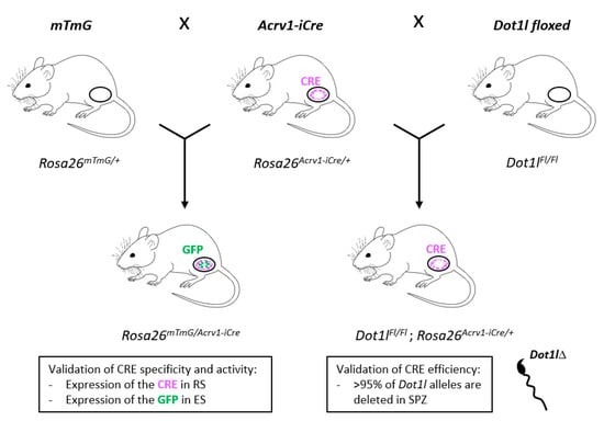 Summary of the results obtained with the Acrv1-iCre mouse line. The three mouse models used in the present study (i.e., mTmG, Acrv1-iCre, and Dot1l floxed lines) are shown on the top of the figure; crossings are indicated with arrows; the resulting mice and genotypes are shown underneath. Oval shapes represent the testes. Cre or GFP expression is indicated in purple or green, respectively. RS: Round spermatids; ES: Elongated spermatids; SPZ: Spermatozoa.
