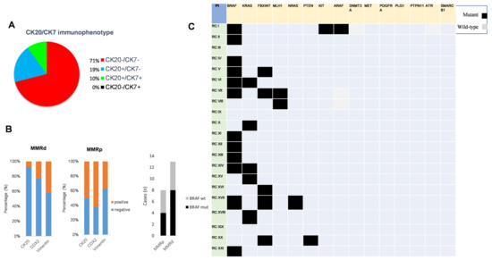 Immunophenotypic and genetic features of RCTs. (A) The combined CK20/CK7 immunostaining profiles in RCTs is shown by a pie chart; (B) Left: CK20, CDX2 and vimentin expression in mismatch repair-deficient (MMR-d) and mismatch repair-proficient (MMR-p) subgroups is shown by graphs. Right: BRAF mutants or wild-type tumors are related to MMR-d and MMR-p subgroups; (C) The recurrence of mutant (black squares) and wild-type (grey squares) in the indicated genes for each patient is shown by a panel.