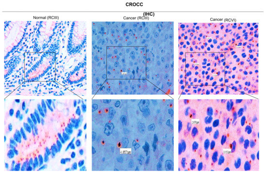 Immunohistochemistry of CROCC in RCT tissues. Left: CROCC IHC in colon normal tissues. Down panel: magnifications show that CROCC is expressed in normal mucosa. Right: CROCC immunohistochemistry in tumor tissues (RCIII and RCVI). Down panels: magnifications show that CROCC is absent in about 50% of tumor cells. Immunosignals foci near the nuclei appear as single and large foci. The size of CROCC-positive foci is shown by white rectangles.