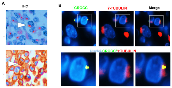 Immunohistochemical (IHC) analysis was performed on tumors and matched normal tissue sections as reported [9]. Four µm thick sections were deparaffined with BOND DEWAX Solution (Leica biosystems, Newcastle, UK), placed in graded alcohol solutions, washed, and pre-treated with the Epitope Retrieval Solution 2 (EDTA buffer pH 8.8) at 98 °C for 20 min. After the washing steps, peroxidase blocking was carried out for 5 min using the Bond Polymer Refine Detection Kit DS9800 (Leica biosystems, Newcastle, UK). Then, the sections were incubated with a rabbit primary anti-human CROCC rabbit polyclonal antibody (clone NBP1-80820, dilution 1:200, (ABCAM, Cambridge, UK)), or an anti-human γ-tubulin mouse monoclonal antibody (clone TU-30, dilution 1:100 (ABCAM, Cambridge, UK)) for 15 min, and a secondary antibody for 8 min, respectively. Subsequently, the sections were incubated with polymer (8 min), revealed with diaminobenzidene-chromogen (10 min), and stained with hematoxylin (10 min). In normal, non-pathological tissues, CROCC staining consists of up to two dot-like signals [9]. Consistently, we considered one or two signals per cell as quantitatively physiological. In contrast, abnormal staining was recorded as follows: (a) loss, less than 1 signal per cell; (b) amplified, more than 2 signals per cell. Two hundred cells in triplicate sections per sample were blindly scored by three authors (A.R., E.M., M.P.). Samples were also immunostained with the following markers: cytokeratin (CK)7, CDX2, CK20, SMARCB1/INI1, and mismatch repair (MMR) proteins (MLH1, PMS2), and scored as previously reported [9].