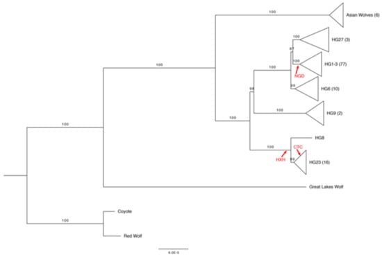Maximum likelihood phylogeny of 118 canid Y chromosomes from []. The clades in the tree have been collapsed by haplogroup assignment. The number of samples within each collapsed node is indicated in parentheses next to the haplogroup assignment. The locations of three ancient samples (NGD: Newgrange grave complex in Ireland; HXH: early Neolithic site of Herxheim in Germany; CTC: Cherry Tree Cave in Bavaria, Germany), as based on the presence of diagnostic mutations, are indicated in red.