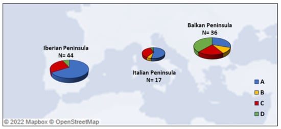 Phylogenetic data suggested a close relationship between Italian [], Iberian [], and Balkan [] canids, since in different cases they share the same mitochondrial haplotype, and corroborated the theory that these geographical areas have played a crucial role in the dynamics of canine domestication. By analyzing a pool of 97 ancient dog mtDNA samples of different dates (time interval from Late Pleistocene to Late Antiquity) belonging to the three Mediterranean peninsulas (Iberian [,,], Italian [,,,] and Balkan [,]) (Table S1), we could analyze the abundance and the distribution of canine mitochondrial haplogroups within the three geographic locations of the fossil recoveries (Figure 4).