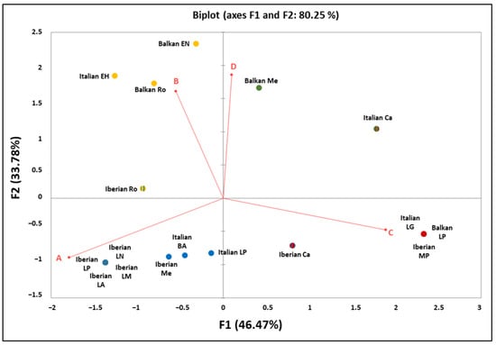 Moreover, in order to graphically display and summarize the mitogenetic relationships among the three Mediterranean peninsulas in different time periods, a Principal Component Analysis (PCA) was performed using Excel software implemented by XLSTAT and with the haplogroup frequencies used as input data (Figure 6; Table S3).