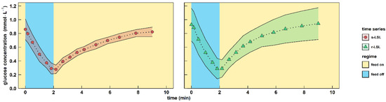 The showcasing stimulus–response experiment enabled the observation of transcriptional feedback mechanisms of the industrial yeast Ethanol Red™ (ScER) after intermittent carbon supply. After anaerobically growing cells were adapted to strict glucose limitation for five residence times in a chemostat, the glucose feed was stopped for two minutes to establish a single limitation–starvation–limitation (s-LSL) cycle. A sharp, uptake-driven drop of the glucose concentration from 0.86 mmol·L−1 to 0.28 mmol·L−1 occurred, which restored to previous steady-state levels within eight minutes after feed resumption (Figure 2, left panel). The biomass-specific glucose uptake rate (qglucose) ramped down from 45% to 21% of the maximum capacities (for qglucose,max, see Table 1). Glucose uptake kinetics remained also for cells that were completely adapted to repeated LSL cycling for five residence times (r-LSL, Figure 2, right panel). Notably, the perturbation never challenged cellular maintenance demands since the minimum qglucose of 2.5 mmol·gDMB−1·h−1 stayed 5-fold above the maintenance rate of 0.5 mmolglucose·gDMB−1·h−1 [42].