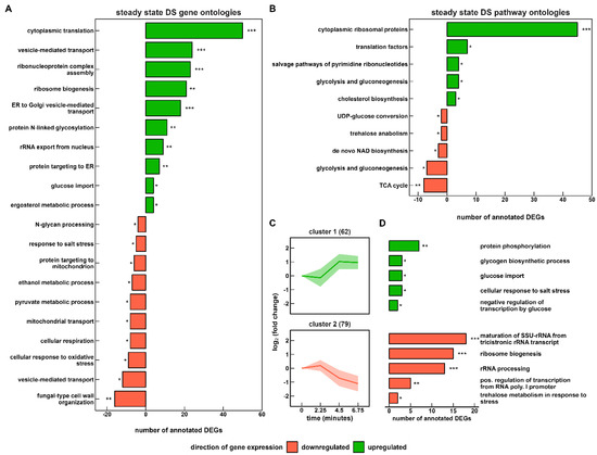 Functional enrichment analysis of DS based on (A) biological function and (B) pathway annotations. Short-term gene expression changes during the repeated (r) LSL cycles are shown in (C). Two k-means clustered groups of co-expressed genes are shown with the number of corresponding genes in brackets (D) representing the corresponding enrichment analysis of biological function. The false discovery rate (FDR) is indicated by asterisks for each category (* 1 × 10−5 ≤ FDR < 5 × 10−2; ** 1 × 10−10 ≤ FDR < 1 × 10−5; *** FDR < 1 × 10−10).