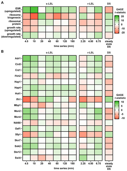 ScER perceived the transient first-time exposure to starvation as an elicitor of the environmental stress response (ESR). As is typical for this program, the early induction of the ESR stimulon coincided with repression of ribosome stimulons represented by the RiBi and RP sets. Strictly growth-rate-dependent sets were considered to discriminate between the onset of the ESR program and mere adjustments of the growth rate. Since amplitudes measured after 10 min of s-LSL exposure of the ESR and RiBi sets showed 2–3-fold larger |t-statistic| values than those of the growth-rate-dependent sets, we concluded that the observed response was dominated by the ESR. This was also backed by constant YDMB/glucose throughout the non-adapted time-series. Similarly to the responses to the s-LSL cycle, r-LSL transcript dynamics reveal dampened oscillations, which are also visible in TF targets. Examples are the Msn2/Msn4 pair and the de-repression through Sok2 target genes. Further examples are also given regarding the repressed ESR branch with Ifh1-guided RP repression and Sfp1 control over both RP and RiBi genes [62,67].