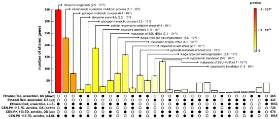 Shared sets of differentially expressed genes under anaerobic (this study) and aerobic [23] conditions in LSL-cycling chemostats. Black dots in the matrix indicate the considered DEG sets, the bar above represents the respective intersection size and the color gradient illustrates significance. The number of genes included in each set is reported on the right. Gene ontologies of the intersection sets are only reported if both the intersection and GO enrichment were significant (FDR < 1 × 10−3).