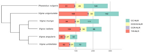 Distribution of NLR genes and its subclasses in P. vulgaris, V. unguiculata, V. mungo, V. radiata, V. angularis and V. umbellata.