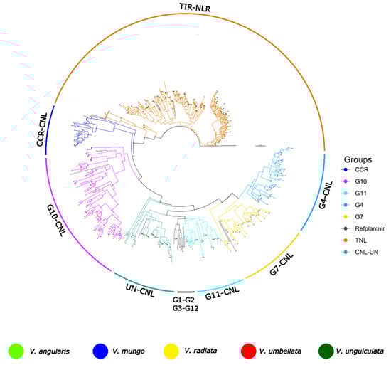 Initially, reference NLR genes and identified NLRome from each species were clustered at 75 percent identity using CD-HIT and utilized for the manual classification of NLR genes. Representative members of NLR genes from each cluster from V. unguiculata, V. mungo, V. radiata, V. angularis and V. umbellata were utilized for the reconstruction of phylogenetic relationship (Figure 3). All five species have shown highly polyphyletic TIR-NLR and CNL-NLR subclasses. Especially five major distinct radiation of TIR-NLR were observed, where majority of putatively novel nodes belonged to V. angularis and V. radiata. In case of CNL-NLR six major sub-groups were observed G4, G7, G11, CNL-UN, CCG10-NLR and CCR-NLR. It is consistent with the previous observation that subgroups G1, G2, G3, G5, G6, G8 are not present in Fabaceae family However, significant divergence and expansion in G4 and G7 were observed in genus Vigna. That might suggest another hypothesis that other CC-CNL subgroups might be removed due to extinction of pathogens of Fabaceae member. As already indicated, helper NLRs (CCR-NLR) were found stable across all genomes and interestingly two major radiation were observed which are common to all five species. However, third radiation were discovered that was only present in V. radiata and absent in other members of this genus. Class CCG10-NLR have shown the highest phylogenomic diversity among all members of this species especially V. radiata and V. angularis. Three major lineages of this subclass were frequently observed for all five species of this genus. In short, NLRome of genus Vigna have shown highly unbalanced gene duplication occurrence that suggest that majority of duplication have occurred after speciation from common ancestor.