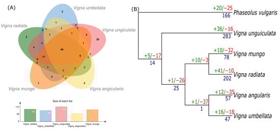 Orthology and birth/death analysis of NLR genes. (A) Venn diagram expressing common ortholog gene cluster found in five species of genus Vigna. (B) Phylogenetic tree expressing number of gained (green) and lost (red) gene families in member species. Number of duplicated genes are added in blue color.