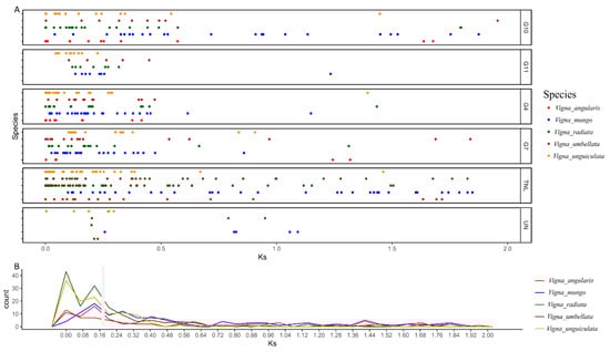 Estimation of NLRome duplication event in the genus Vigna. All five species belonging to the genus Vigna with Ks values of their paralogs are denoted. (A) The vertical axis indicate Ks value and horizontal axis shows frequencies. (B) The generalized observed duplication manner in all species.